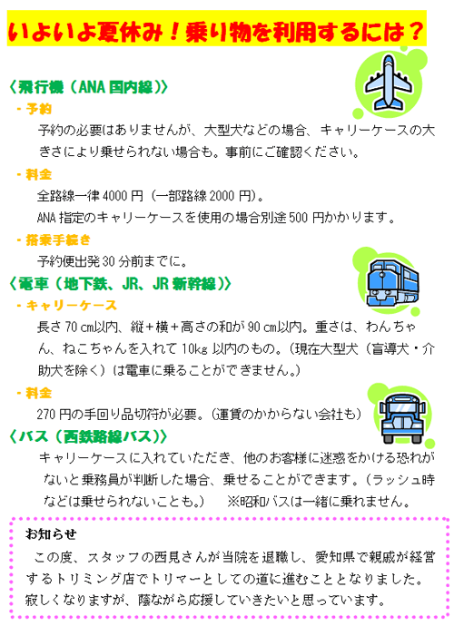 ゆじ動物病院通信 Vol.4の3:飛行機・電車・バスの乗り方(2008-07-02)、福岡前原のゆじ動物病院がお届けする季節のイベントやお客様にとてもお得なニュース情報満載